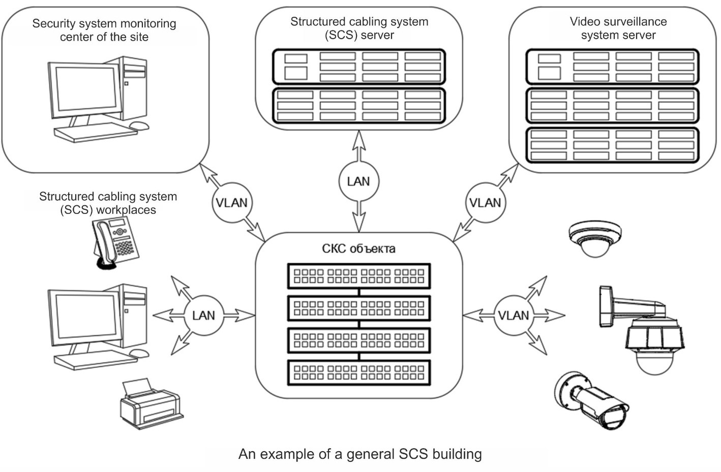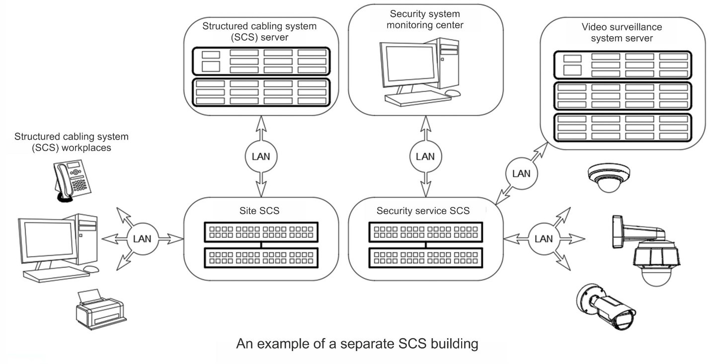 At present, an IP video surveillance system is most widely spread constructed on the basis of the structured cabling system of the facility. The system may be based on a separate structured cabling security system with a differentiation of access to active equipment of the network and on a virtual segment (VLAN) of a general structured cabling system of the facility.