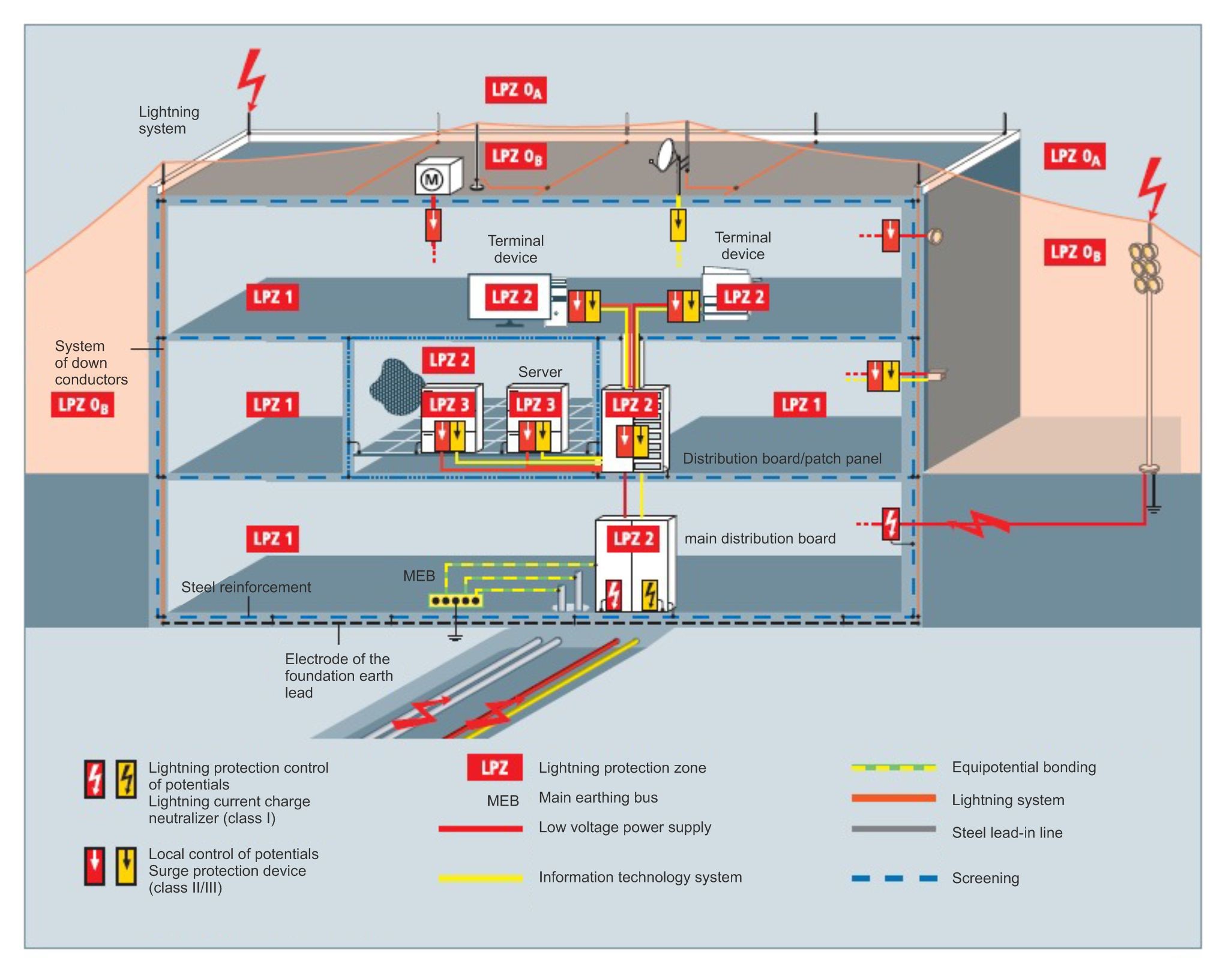 To provide continuity of complex power supply and operability of informational technologies systems, even in case of a direct strike of lightning, it is necessary to take measures for protection of electrical and electronic plants and units based on the building lightning protection system. It is important to consider all possible cases of pulse overvoltage. For this purpose a zone lighting protection concept is used.