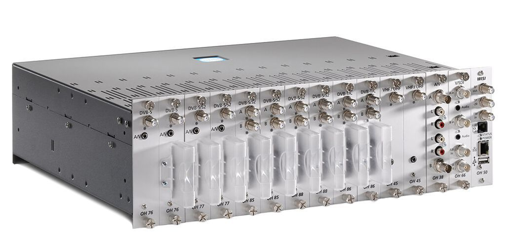 Base unit (chassis) of the WISI OH head-end station for 50 and 14 modules with installed modules.
