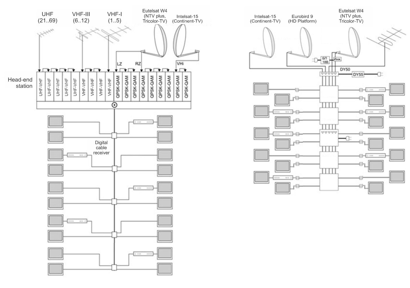 Examples of a single-cable system with a head-end station and a matrix system with the use of multi-switches.